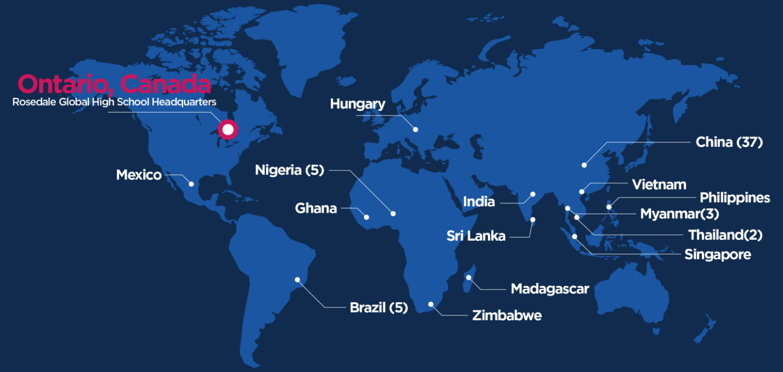 Rosedale Global High School is an independent, Ontario-based Canadian private high school inspected by the Ontario Ministry of Education in Canada under Board School Identification (BSID) number 668726 and is authorized to grant the Ontario Secondary School Diploma (OSSD) to graduates of Rosedale Global High School. We employ Ontario Certified Teachers (OCT) to provide independent and centralized evaluation from Canada for our Ontario secondary school curriculum. In the 2024-2025 academic year, Rosedale Global High School will provide education to secondary education students in collaboration with 62 partners in 95 schools across 17 countries.